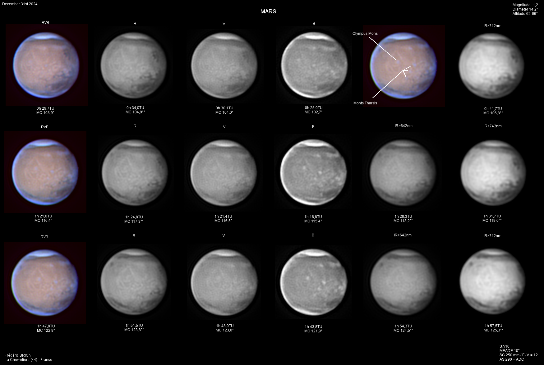 Paramètres de traitement de l'image : Alignement, addition, traitement ondelettes sous Registax 6 - Assemblage RVB sous Winjupos - Commentaire : Sur ces images, les nuages orographiques au-dessus des volcans de Tharsis commencent à se former. Ils apparaissent vers le milieu de la journée martienne et gonflent durant l'après-midi. Sur l'image RVB, il est midi sur Ascraeus, Arsia et Pavonis, mais il n'est que 10 H encore sur Olympus Mons.