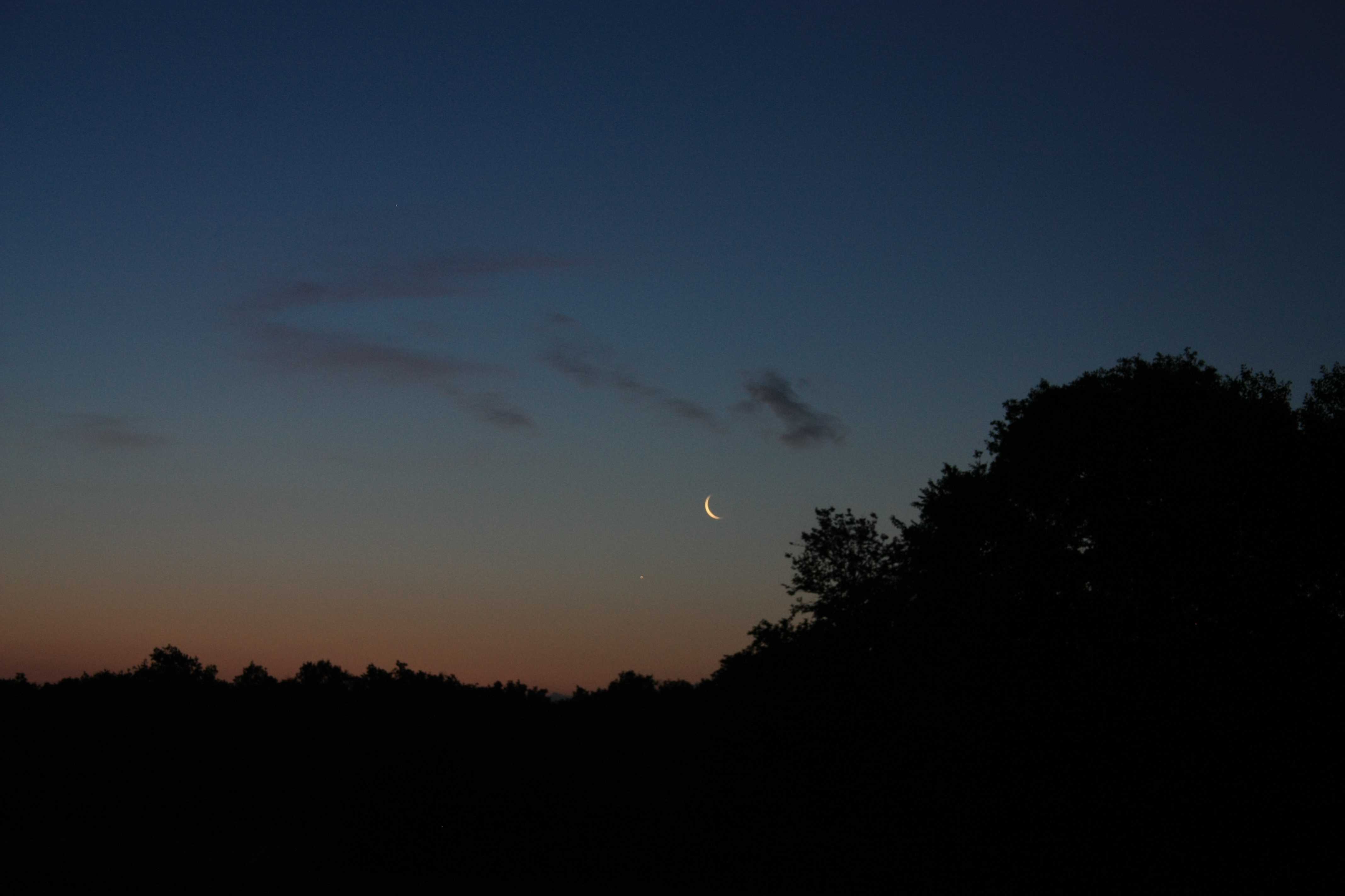 - Commentaire : La Lune est accompagnée de Jupiter juste en dessous à gauche, Vénus s'extirpe des arbres à l'horizon sous le passage des oiseaux