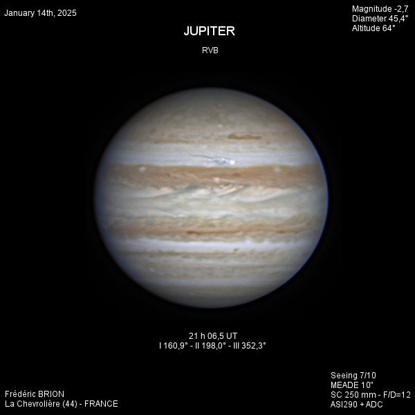 Le satellite quittera définitivement le disque jovien vers 22h35 suivi de son ombre vers 23h50, heure ou la grande tache rouge se lèvera sur le bord opposé de la planète